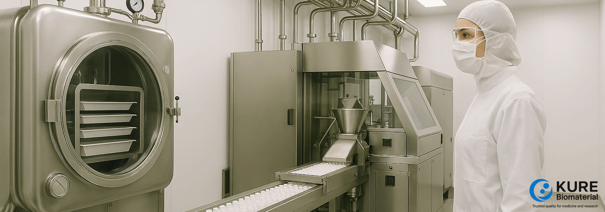 当社は、生体由来材料について薬機法(医薬品、医療機器等の品質、有効性及び安全性の確保等に関する法律)に基づく加工役務を提供しています。あわせて、研究用試薬および化粧品原料の製造を行い、原料の来歴管理とロット追跡を徹底しています。凍結乾燥(Freeze-Drying, FD)による希少タンパク質の安定化や前処理・充填・ラベリングまで、工程設計を含めてご相談いただけます。